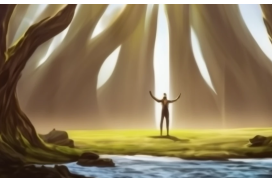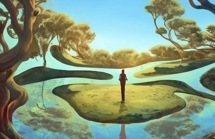 Ein Wanderer steht vor zwei Pfaden im Wald. Er denkt, er wählt den linken. Doch die Wege sind geformt durch Boden, Licht, Tiere und Wind. Jeder Schritt ist bestimmt von den Bedingungen, die ihn umgeben. Und doch empfindet er Freude über die Wahl, die er trifft – sie ist echt, aber eingebettet in die Ordnung des Waldes. - Der Beobachter